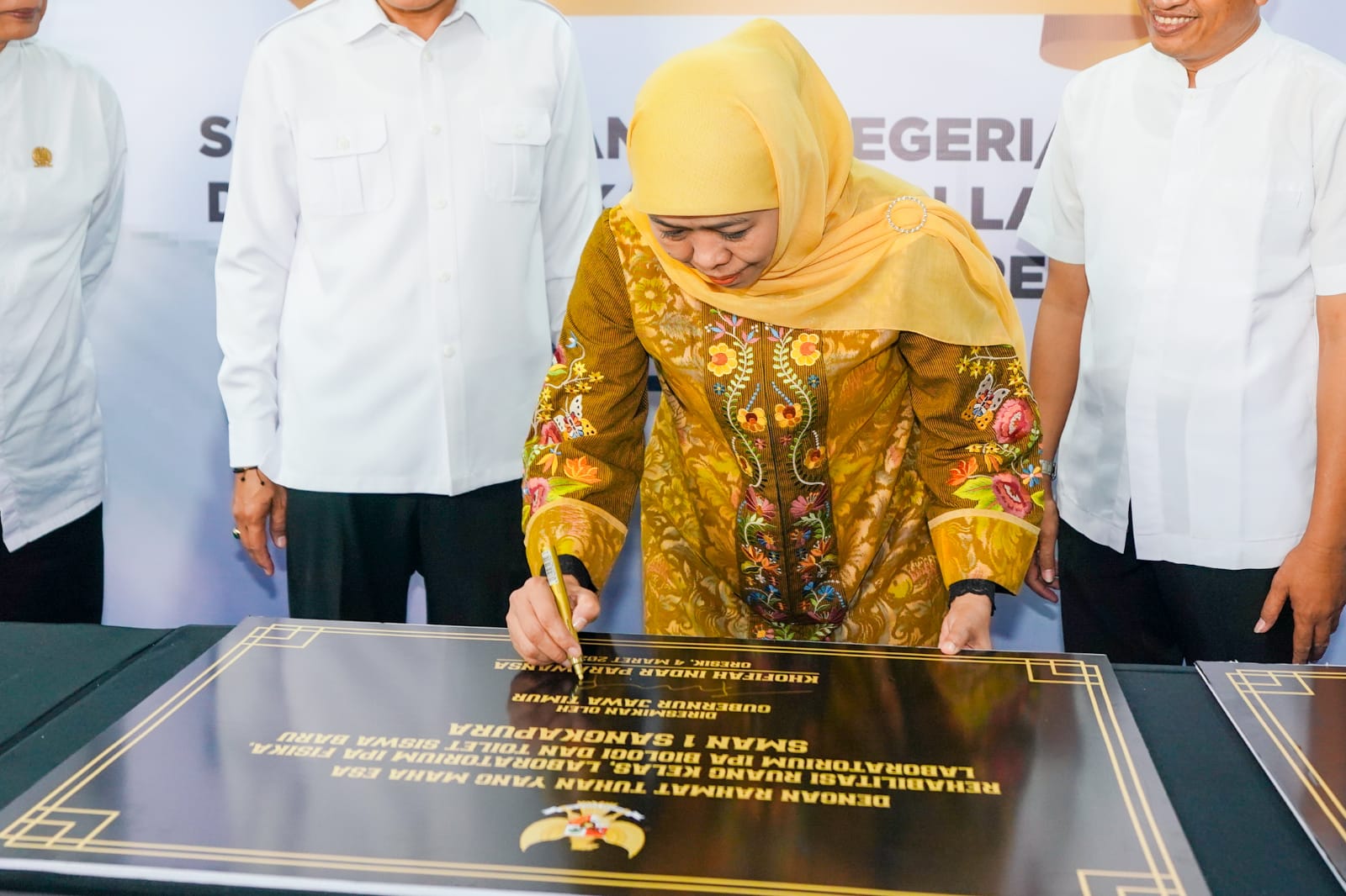 Gubernur Khofifah menegaskan bahwa prasasti tersebut bukan sekadar penanda pembangunan fisik, tetapi juga simbol komitmen bersama untuk menjaga dan merawat fasilitas pendidikan yang telah dibangun.